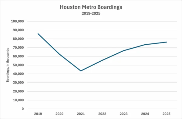 Houston Metro recently released its year-end ridership report.1 It shows that total ridership marginally improved last year from 73.3 to 76.3 million boardings, a 4% increase.2 Immediately before the pandemic, Metro had nearly 86 million boardings, so it is still about 11% shy of returning to pre-pandemic ridership levels, but has seen a nearly 15% increase since the change in leadership at Metro ushered in by the Whitmire administration.
