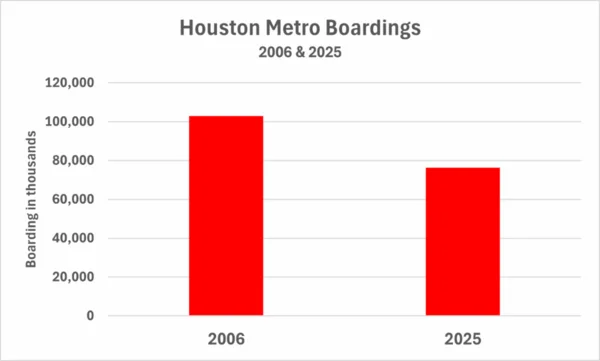 The light rail system continued to prove what a disastrous investment it has been. Its ridership fell by 3% and is almost a third below its pre-pandemic level. The Purple and Green lines' ridership is particularly dreadful, with boardings at a fraction of the pre-construction projections. Both, along with the extension of the Red line to the north, have been cited in FTA reports as being among the worst performers in the nation, relative to their ridership projections. This is one of the reasons Houston is unlikely to ever receive any more FTA funding for LRT or BRT projects.